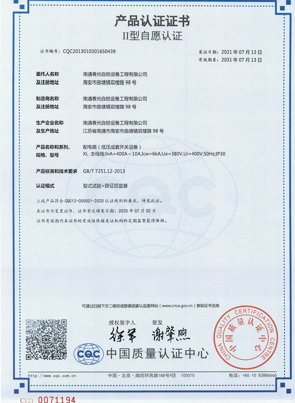 交流低壓配電柜認(rèn)證證書